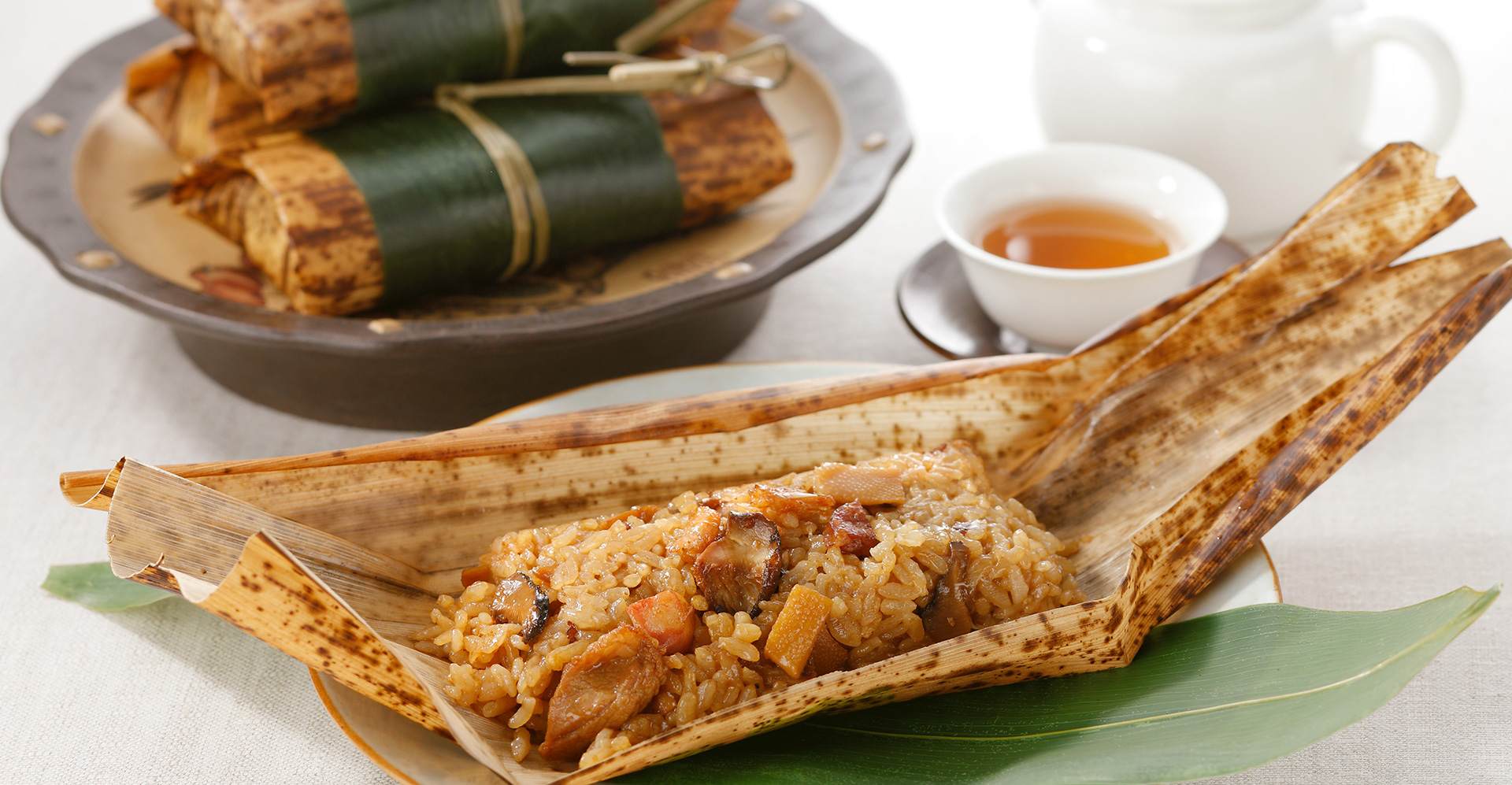 端午の節句にちなんだ期間限定商品の「屈原ちまき」 もち米に柔らかく煮込んだ豚肉や干し海老、腸詰、貝柱などの具材を加えて、 笹の葉を竹の皮で包んで蒸した香り高い自慢の逸品です。