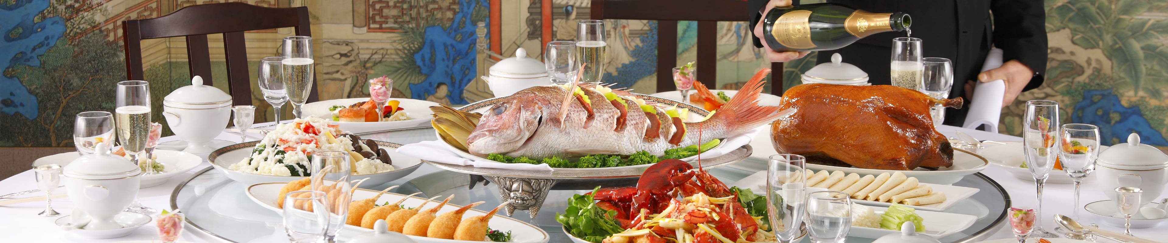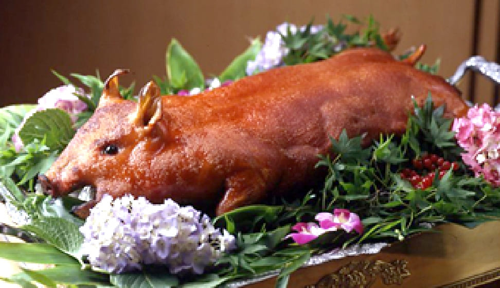 生後40日前後の乳呑み仔豚のやわらかな皮に、香辛料や蜜を塗り、陰干しした後、炭火で焼き上げます。皮の美味を極めた広東省の祝宴料理です。