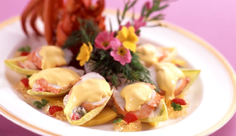 伊勢海老にフルーツを合わせた、彩り豊かなオードブル。海の恵み豊かな中国南方系のお料理で、華やかな祝席のスタートにおすすめです。