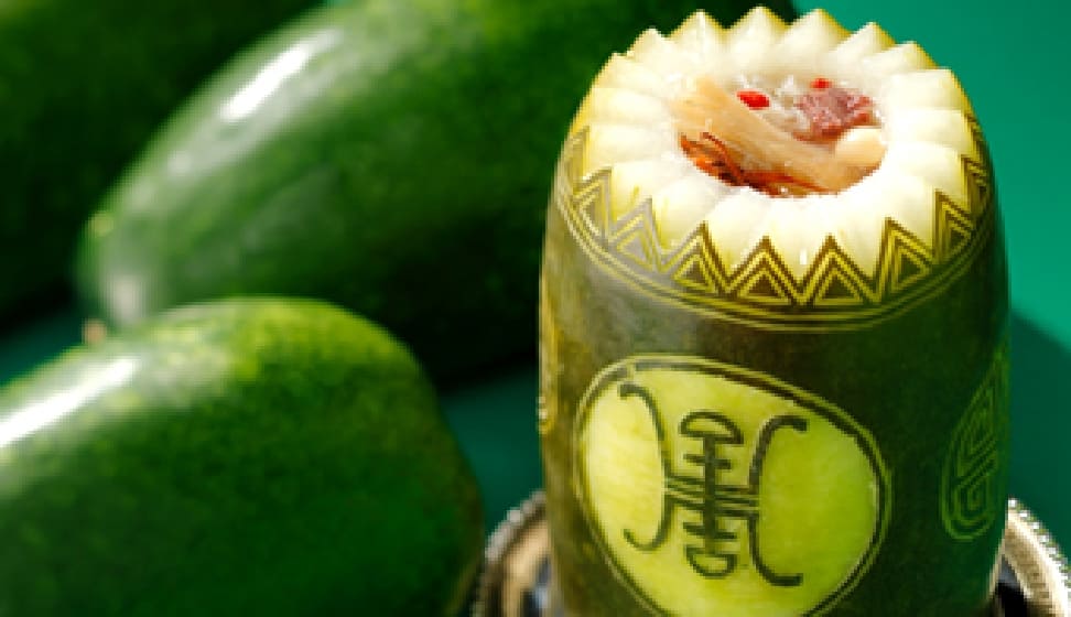 金華ハムと丸鶏を使った上湯の旨味がしみ込んだ冬瓜は、美しく透き通り、とろりと柔らか。冬瓜にご希望の文字彫りを承ります。思い出に残るご宴席を演出します。