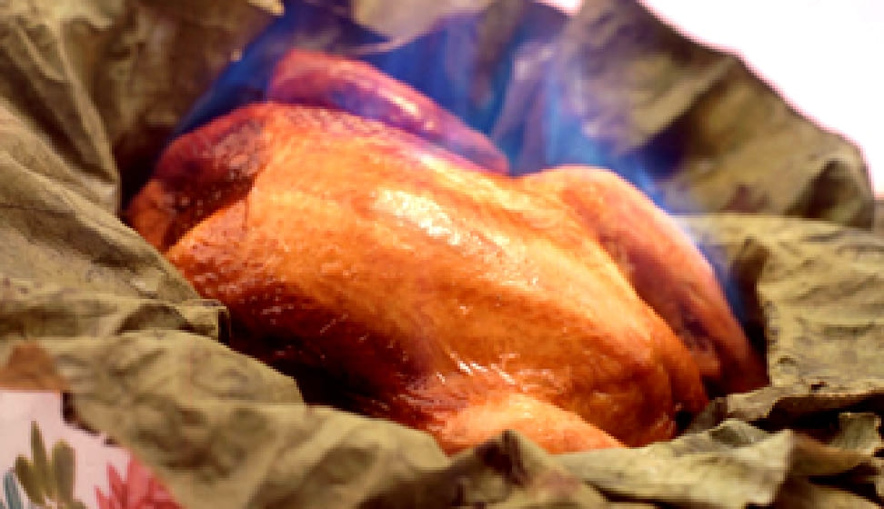 具を詰めた鶏を蓮の葉で包み、卵型の土の器で焼いた江蘇省の名物料理。木槌でたたいて器を開き、皆さまで分け合っていただく幸せのお料理です。