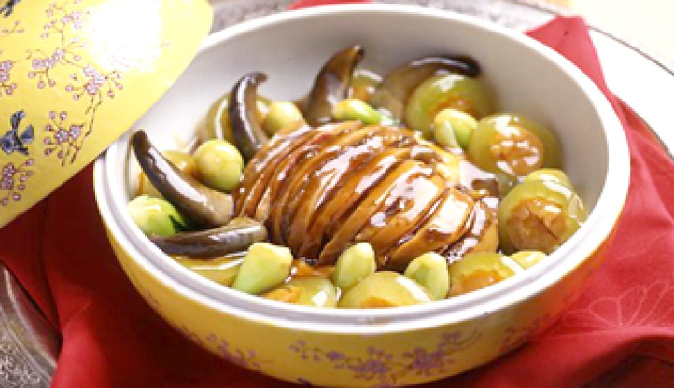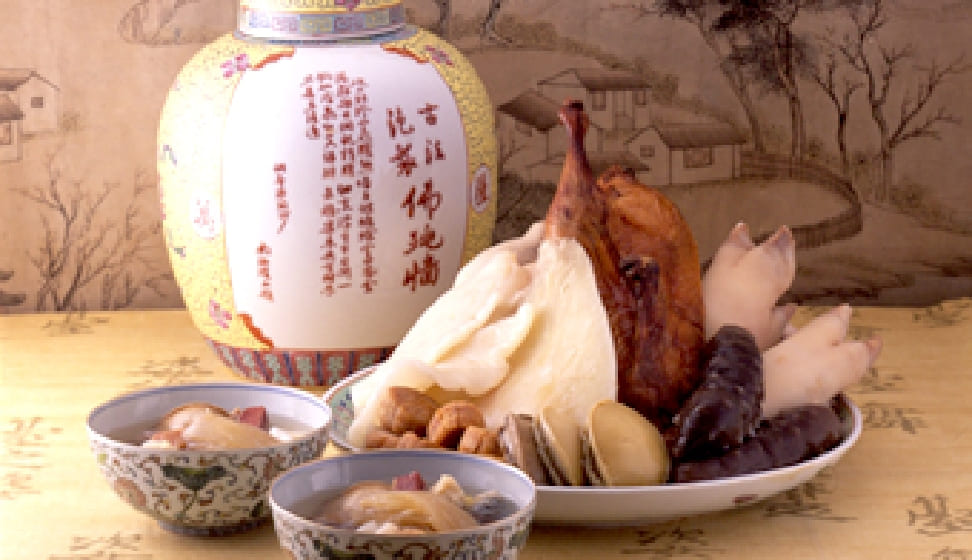 20種を越える材料で抽出したスープに、ふかのひれ、なまこ、干し鮑を加えた壷蒸しは、その香りのすばらしさに、僧侶も戒律を忘れ牆(垣根)を飛び越えて食べに来ると称えられた名菜です。