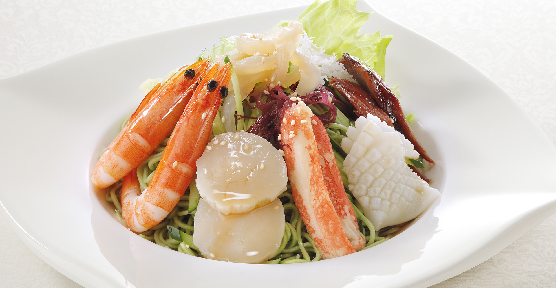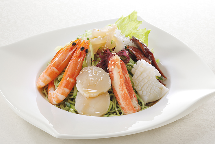 翡翠色の自家製麺を使用した見た目も涼しげな冷麺です。蟹、海老、帆立などの海の幸を贅沢に盛り合わせた逸品を数量限定でご用意しております。甘酢と胡麻だれからお選びいただけます。